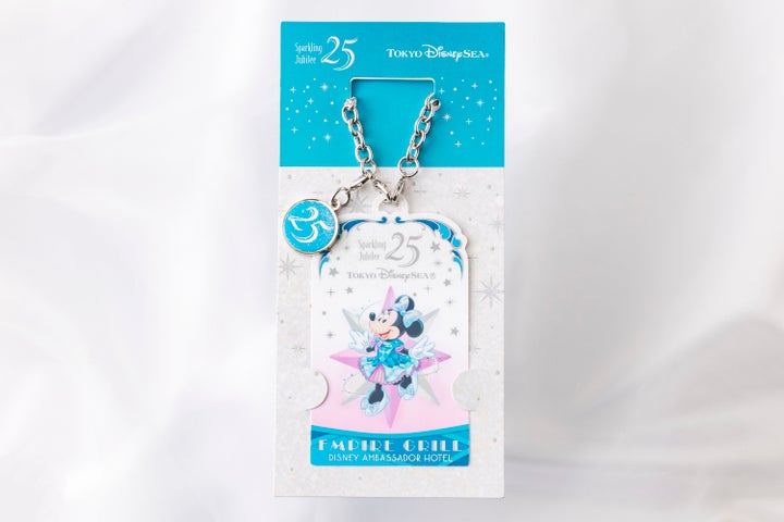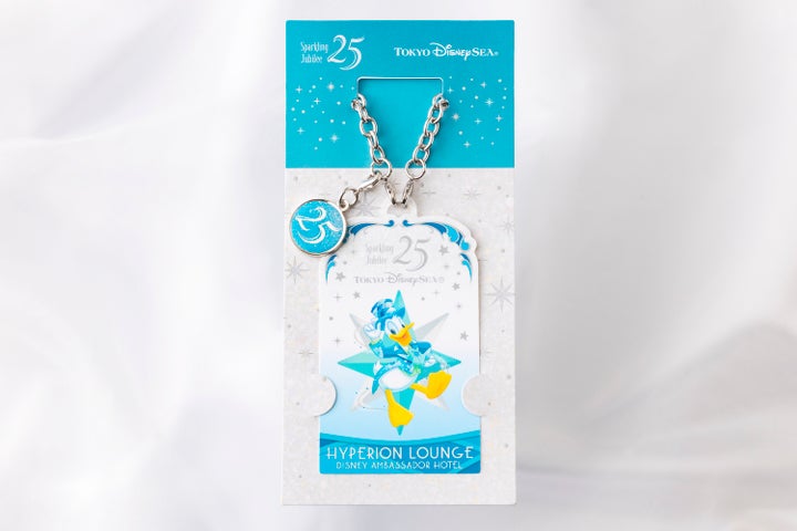 ジュビリーブルーの衣装を身につけたディズニーの仲間たちが描かれたオリジナルデザインのカードキーとキーケースを購入できます。キーケースは両ホテル共通のデザインです。