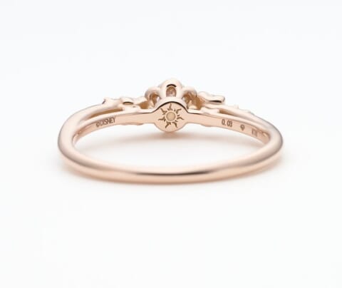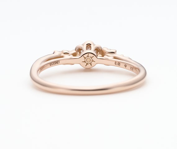 「光に導かれて、初めて外の世界へ飛び出したラプンツェル」の物語を表現したデザインです。髪を結ってもらい小花で飾られたラプンツェルの可憐な三つ編みヘアと散りばめられた小花をリング全体で繊細に表現しています。石座の裏には、物語の象徴的なモチーフである「太陽の紋章」が刻印され、ふっくらと立体感のある花びらフォルムの石座が特徴です。