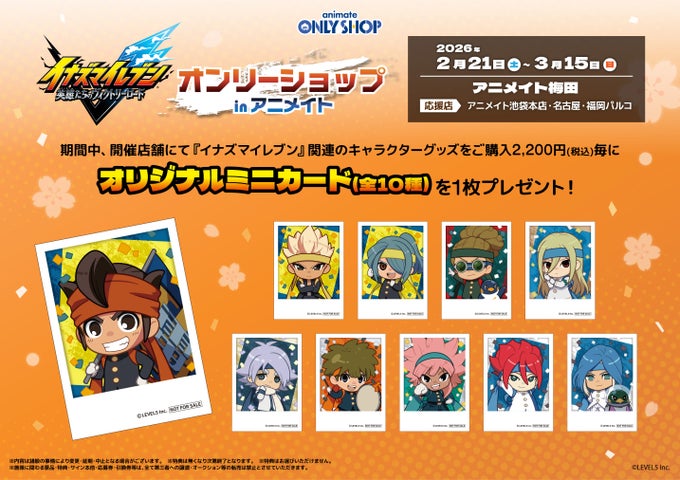 『イナズマイレブン 英雄たちのヴィクトリーロード』のオンリーショップが、2026年2月21日よりアニメイト梅田で開催されます。新商品や特典、特大スタンディパネル展示を提供します。