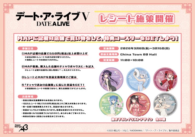 「TVアニメ『デート・ア・ライブV』×横浜中華街コラボ」では、レシート施策も実施します。