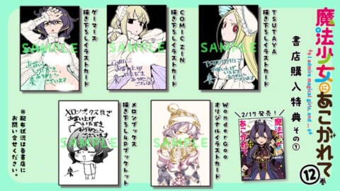 『魔法少女にあこがれて』第12巻の購入で、店舗ごとに異なる特典を用意しています。特典は無くなり次第終了のため、早めの入手をおすすめします。