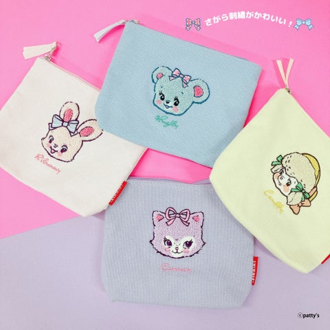SWIMMERの人気キャラクターであるくまの「ハグリー」、ねこの「キャミー」、うさぎの「リバニー」、ひつじの「ラッフィー」たちのサガラ刺繍が施されたポーチです。キャラクターのお名前も刺繍で入っています。