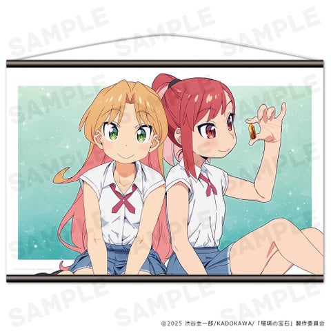 「瑠璃&硝子」のイラストを大きく楽しめるB2サイズのタペストリーです。ポリエステルスエード素材を使用し、鮮やかな色彩が特徴です。上部に紐が付属しており、部屋に飾って作品の世界観を演出できます。