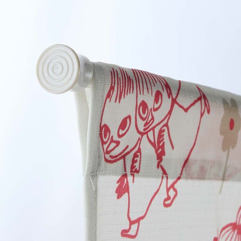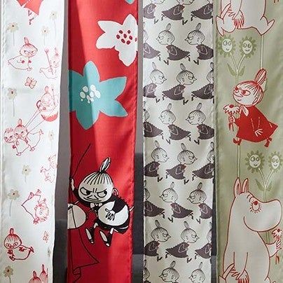 それぞれ色と柄が異なる4種類の布が連結したのれんは、掛けるだけでお部屋全体の印象を明るく演出します。モチーフを大きく印刷した布と細かなモチーフの布を交互に配置するなど、デザインにもこだわりが見られます。4連に分かれているため通り抜けやすく、間仕切りや目隠しとしても活用できます。