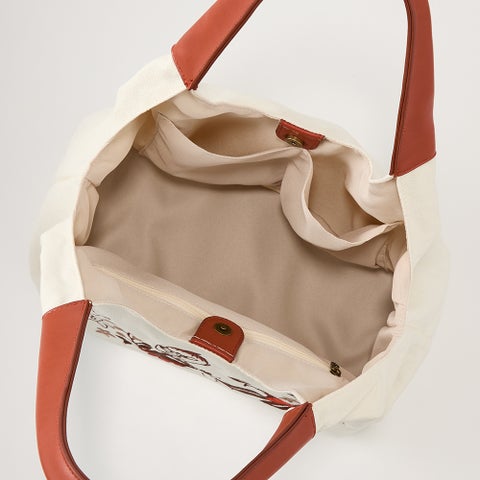 キャンバス地に刺繍を施し、リトルミイの豊かな表情を贅沢に表現しました。コロンとしたバルーン型のシルエットが可愛らしく、持ち手には合皮を使用することでシックな印象に仕上げています。