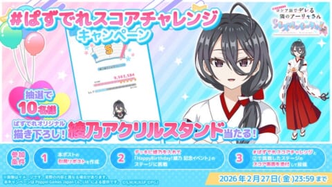 君嶋 綾乃の誕生日を記念し、ゲーム公式Xにて「#ぱずでれスコアチャレンジキャンペーン」を2026年2月21日(土)12:30より開催します。ゲーム内の「HappyBirthday! 綾乃 記念イベント」ステージで、綾乃をデッキに編成してプレイし、その画面を添付して投稿することで参加可能です。