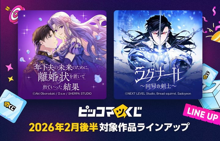 株式会社カカオピッコマは、オンラインくじサービス『ピッコマくじ』の2月後半新作を発表しました。『年下夫の未来のために、離婚状を置いて出ていった結果』は2月18日、『ラグナール〜回帰の剣士〜』は2月25日より販売を開始します。ピクチャーズくじ