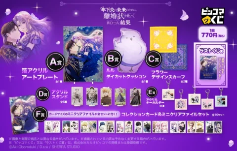 2026年2月後半は、『年下夫の未来のために、離婚状を置いて出ていった結果』と『ラグナール〜回帰の剣士〜』の限定グッズが登場しました。これらの商品は『ピッコマくじ』でしか手に入らない特別なアイテムです。