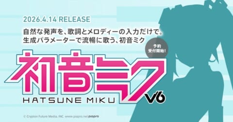 クリプトン・フューチャー・メディア株式会社は、歌声合成ソフトウェア『初音ミク V6』の発売日を2026年4月14日(火)に決定し、本日2026年2月18日(水)より予約受付を開始しました。本製品はボーカルエディター同梱の〈スターターパック〉と〈ボイスバンク〉の2形態で展開します。