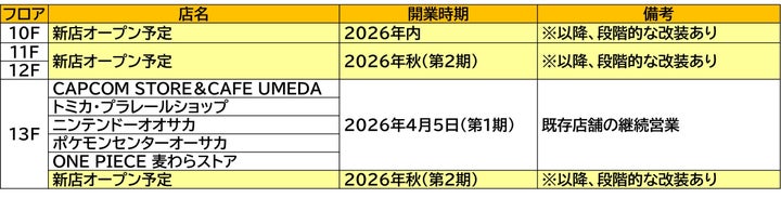 • 「ポケモンセンターオーサカ」「ニンテンドーオオサカ」「ONE PIECE 麦わらストア」など、5店舗が営業を継続し出店します。