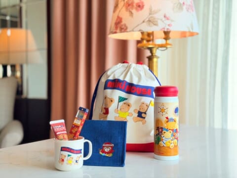 今回のコラボレーションプランでは、お子様が安心して楽しめるよう、客室全体にミキハウスの世界観を取り入れたオリジナルアイテムを配置しています。視覚的にも楽しい工夫が凝らされています。
