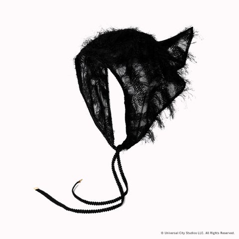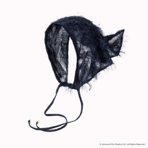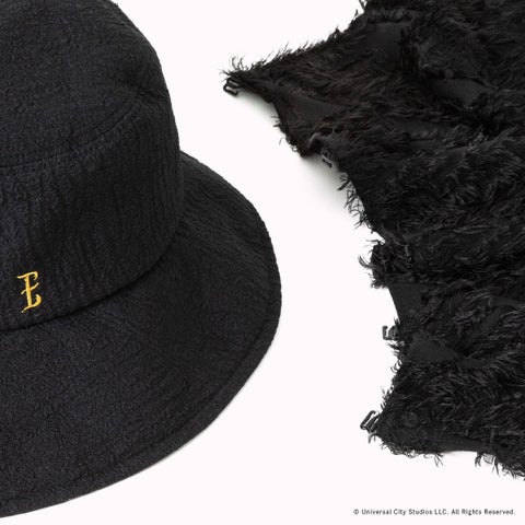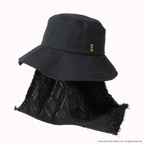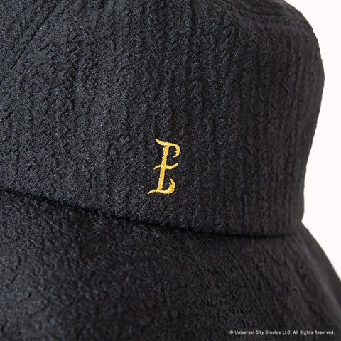 凹凸のあるテクスチャーと斜めに入れた切り替えで、エルファバが劇中でかぶる帽子の立体感を表現したハットです。取り外しのできるサンシェードには、エルファバのロングヘアを思わせるインディアンカットジャカードを使用します。