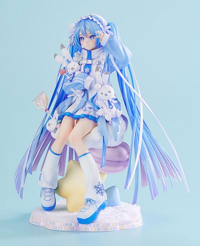 本フィギュアは、『キャラクター・ボーカル・シリーズ01 初音ミク』より、雪ミク スカイタウンオープン10周年を祝しイラストレーターのiXima氏が描き下ろした記念ビジュアルを1/7スケールで立体化したものです。ふわふわのクッションにちょこんと座る雪ミクの姿を、ラビット・ユキネや可愛らしい小物と共に丁寧に表現しました。