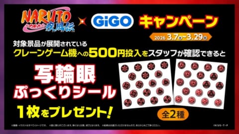 全国のGiGOグループのお店およびGiGO ONLINE CRANEでマストバイキャンペーンを実施します。対象景品を展開するクレーンゲーム機に500円(GiGO ONLINE CRANEでは有償500SP)を投入したことをスタッフが確認すると、「写輪眼ぷっくりシール(全2種)」をランダムで1つ進呈します。