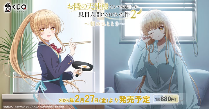 クオリティコンフィデンス株式会社が手掛ける新くじサービス「くじQ」にて、TVアニメ『お隣の天使様にいつの間にか駄目人間にされていた件2』の新作くじ「~朝のひととき~」が登場します。大人気ヒロイン・椎名真昼の描き下ろしビジュアルを使用したグッズが多数ラインナップします。