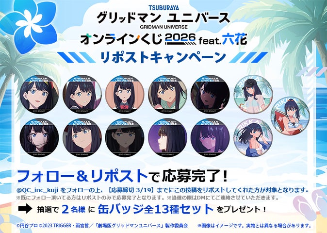 オンラインくじの販売開始を記念して、Xアカウント「QCくじ情報」ではプレゼントキャンペーンを実施しています。抽選で2名に缶バッジ全13種セットが当たるチャンスです。