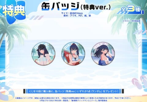 くじを10回購入するごとに、【缶バッジ(特典ver.)】(全3種)からいずれか1点がランダムでプレゼントされます。特典は各サービスサイトによって配布条件が異なる場合があります。