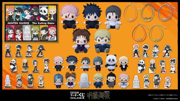 本くじは、TVアニメ『呪術廻戦』の「死滅回游」をテーマに描きおろした、セガ限定のデフォルメイラストを使用したオンラインくじです。ポップな雰囲気とキャラクターたちの個性あふれる表情にご注目ください。「アクリル色紙」や「アクリルスタンド」のほか、「ブレスレット」「ぬいぐるみ」など、多種多様な賞品をラインナップしています。