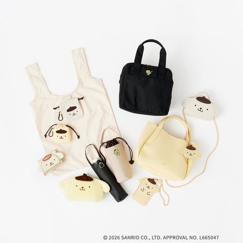 ポムポムプリンのかわいらしいお顔をデザインに取り入れたポーチ、ウォレット、保冷ランチシリーズ、エコバッグなど、大人のための日常使いアイテムが幅広く展開されます。 |