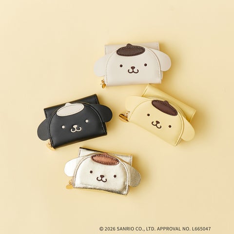 ポムポムプリンの可愛らしいお顔がデザインされたミニウォレットです。ミニバッグにも収まる三つ折りタイプのコンパクトなサイズ感が魅力です。上品な合皮素材を使用し、機能面も充実しています。コインポケットはファスナー開きで大きく開くササマチ付き設計のため、中身の取り出しが容易です。お札収納部分にはカードポケットも備え、実用性も確保します。ファスナー引手にはポムポムプリンデザインのオリジナルメタルパーツを使用します。
