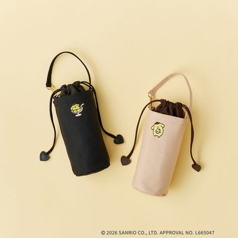 丈夫な帆布調の生地を使用した保冷機能付きスリムケースです。通勤や通学シーンで活躍し、ポムポムプリンの可愛い刺繍が施されています。500mlペットボトルが収まる幅に余裕を持たせたデザインで、ドローコードの先端はハート型です。フック付きストラップが付属するため、バッグなどに取り付けて持ち運びできます。周年記念限定デザインの下げ札・ネームが付属します。