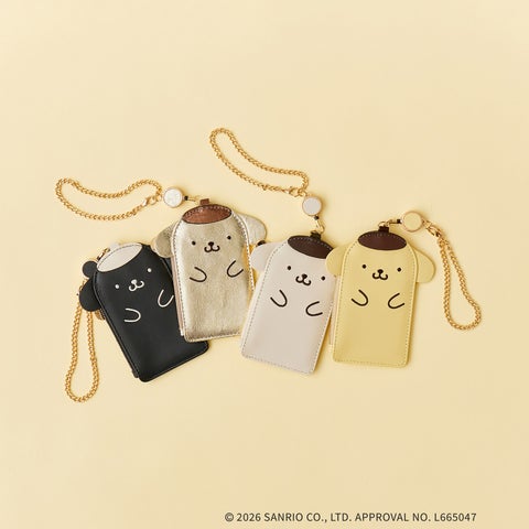 ポムポムプリンの愛らしいお顔がデザインされたパスケースです。上品な合皮素材を使用し、幅広いシーンで活躍します。カニカン付きでバッグチャームとしても取り付け・取り外しが容易です。ICカードや社員証などのカード類を収納でき、クリア窓付きのためトレカケースとしても使用可能です。伸縮リールが付属するため、バッグに取り付けたまま改札をスムーズに通過できます。ファスナー引手にはポムポムプリンデザインのオリジナルメタルパーツを使用します。