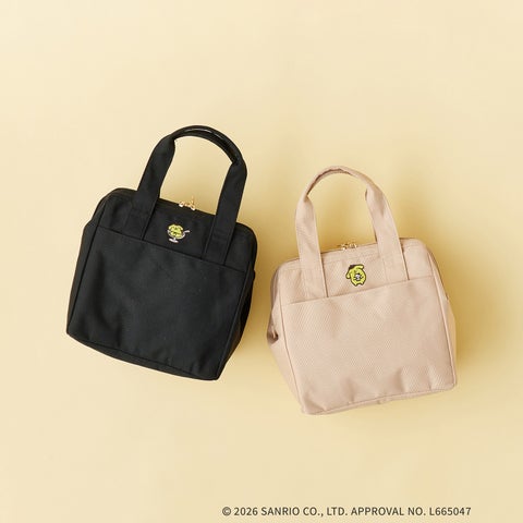 丈夫な帆布調の生地を使用した保冷機能付きトートバッグです。通勤や通学シーンに最適なサイズで、ポムポムプリンの可愛らしい刺繍がアクセントになっています。内側にはペットボトルや水筒を固定できるゴム、内外にポケットがあり、細かなアイテムの仕分けに便利です。ファスナー引手にはポムポムプリンデザインのオリジナルメタルパーツを使用し、周年記念限定デザインの下げ札・ネームが付属します。