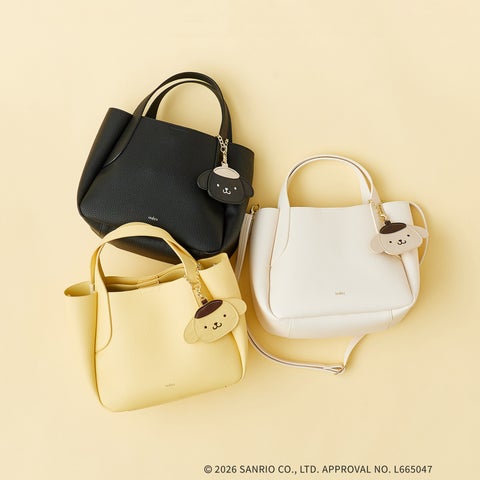 軽量のシュリンク合皮素材を使用した、使いやすいミドルサイズのトートバッグです。表面の凹凸素材はキズや汚れが目立ちにくい特徴を持ちます。内側には縫い付けポケットを備え、500mlのペットボトルも収納可能です。取り外し可能なポムポムプリンのお顔型オリジナルミラーチャームと、周年記念限定デザインの下げ札・ネームが付属します。