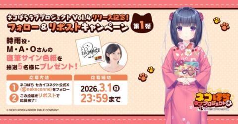 『ネコぱら ラブプロジェクトVol.4』のリリースを記念し、時雨役のM・A・Oさんとフレーズ役の山本希望さんの直筆サイン色紙が当たるキャンペーンが『ネコぱら セカイコネクト』公式Xにて2週連続で開催されます。