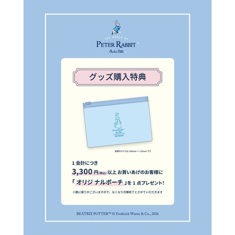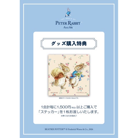 ピーターラビット™商品を税込1,500円以上お買い上げのお客様にステッカーを1枚、税込3,300円以上お買い上げのお客様にはクリアポーチを1枚プレゼントします。この特典も1会計につき1枚限りで、なくなり次第終了となります。