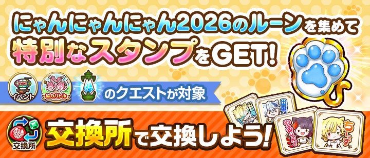 『白猫』ゲーム内のクエストをクリアすると、「にゃんにゃんにゃん2026のルーン」を獲得できます。獲得したルーンは、交換所で本催事限定のグラフアートを使ったスタンプと交換できます。