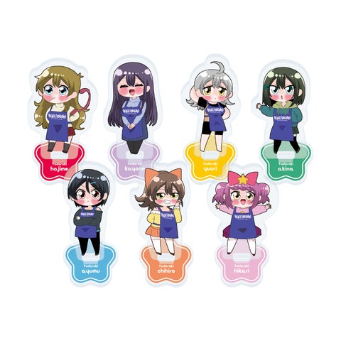 各キャラクターのサイズは、はじめがH7.7×W5.3cm、かよねがH8×W4.5cm、ゆうりがH7.9×W4.5cm、あきながH7.6×W4.5cm、あゆむがH7.6×W4.5cm、ちひろがH7.6×W4.5cm、ひかりがH7.4×W5.5cmです。