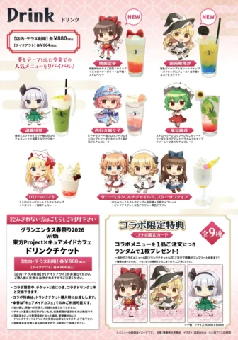 「グランエンタス春祭り2026 with 東方Project」の開催に合わせ、キュアメイドカフェでもコラボカフェを実施します。春をテーマにしたリバイバルメニューや新作ドリンクが登場し、コラボメニューの注文で特典が手に入ります。
