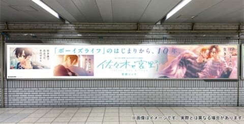 連載10周年を記念した交通広告をJR池袋駅にて掲出します。校舎裏での出会いをきっかけに物語を育むふたりの様子を描写しています。