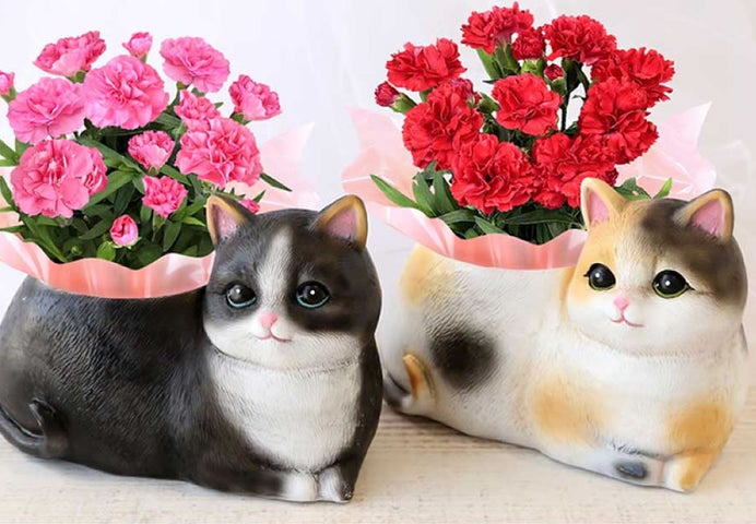母の日の贈り物にもおすすめの「おすましキャット&カーネーション」は、通常価格4,380円(税込み)です。つぶらな瞳で見つめるリアルで愛らしい三毛猫ポットまたはハチワレポットに、鮮やかな赤やピンクのカーネーションがあしらわれています。お部屋をパッと明るく彩り、見る人に癒やしを与えるギフトです。