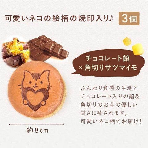 デスク周りで活躍する実用的な「猫の一輪挿し&お芋チョコどら焼きセット」は、通常価格3,979円(税込み)で提供しています。お手入れ不要で長く楽しめるドライフラワーと、可愛らしい猫ポットの組み合わせです。猫ポットは一輪挿しとしてはもちろん、ペン立てやハサミなどの小物入れとしても活用できます。セットには、ハートを抱きしめた猫のオリジナル焼き印が施されたお芋チョコどら焼きも含まれており、中には特製餡とゴロゴロとした角切りのお芋がたっぷり入っています。