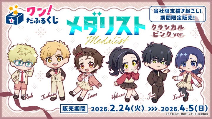 TVアニメ『メダリスト』のオンラインくじ「ワン!だふるくじ」が、2026年2月24日(火)12:00より販売開始します。描き起こしデフォルメイラストを使用した豪華景品が登場。開催内容や参加方法を詳しく紹介するのでぜひ参考にしてください。また、2026年4月5日(日)23:59まで販売しますのでぜひご検討ください。サービスを展開する株式会社ワンダフルワンが提供するオンラインくじサービスにて開催です。