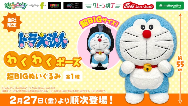 株式会社イオンファンタジーは、プライズゲーム用景品として『ドラえもん わくわくポーズ超BIGぬいぐるみ』を、2026年2月27日(金)よりアミューズメント施設およびオンラインクレーンゲーム「モーリーオンライン」にて順次展開します。