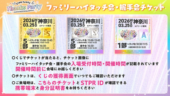 • 参加方法: 『STPR Family ThanksParty!! ハイタッチ&握手会 in Kアリーナ横浜』特設サイトよりアクセスし、くじに参加します。