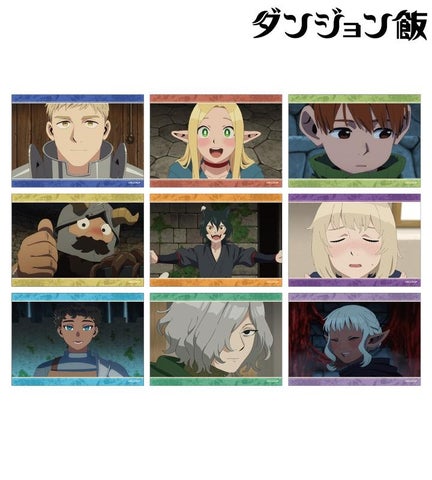 ライオス、マルシル、チルチャック、センシ、イヅツミ、ファリン、カブルー、ミスルン、シスルの9キャラクターそれぞれの印象的なシーンをデザインしたイラストカードとブロマイドです。