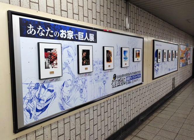 東京メトロ護国寺駅では、『進撃の巨人イラストパネル』のサンプルが掲出されています。壁一面に並べられた実物のパネルは、まるで美術館のような空間を演出します。お近くにお立ち寄りの際は、ぜひこの機会にご覧ください。