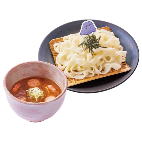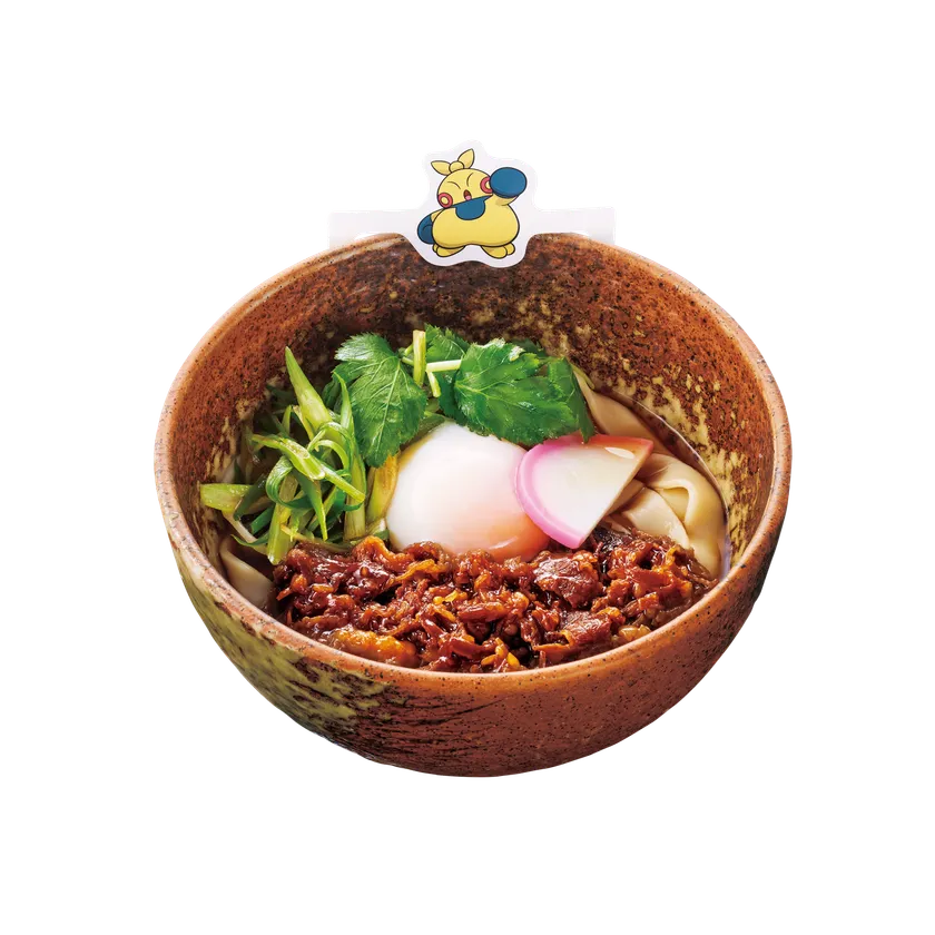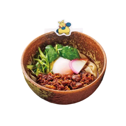 おかげ庵の定番きしめんが特別メニューで登場。メタモンの色味を表現した桜色のふわふわつみれとエビ入りのスープにつけて食べる一杯です。魚粉の旨みが効いたコクのあるスープと、もちもちの麺が楽しめます。