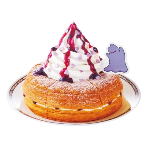 あたたかいデニッシュに爽やかな酸味のあるチーズクリームをサンドし、甘酸っぱいブルーベリーソースを合わせました。ソフトクリームにはメタモンをイメージしたハートシュガーをトッピングします。
