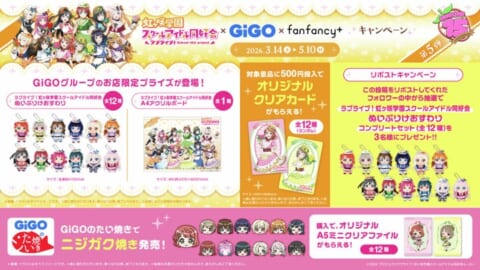 GiGOグループが「ラブライブ!シリーズ」15周年を記念し、「ラブライブ!虹ヶ咲学園スクールアイドル同好会」とのコラボキャンペーン第5弾を3月14日より開催します。限定景品、コラボカフェ、オリジナル物販、コラボたい焼きなどを展開します。