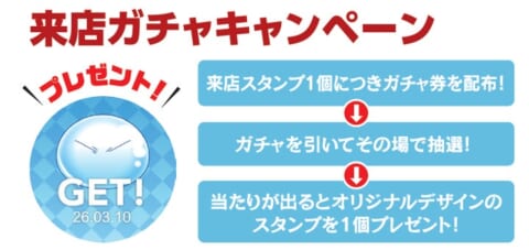 また、来店ガチャで当たりが出るとリムル(スライム)の来店スタンプをプレゼントするほか、キャンペーン期間中はアプリの来店スタンプがコラボオリジナルデザイン(全5種)に変わります。