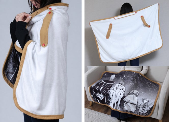 本製品は、2WAY仕様が特徴の特製ブランケットです。オモテ面には勇者一行の印象的な名シーンを大胆にデザインしており、羽織るだけでなく、広げてインテリアとして飾ることで物語の世界観を演出します。ウラ面はフリーレンが旅路で着用するケープを再現しており、肩に掛けることでフリーレンの気分を味わえる遊び心も取り入れています。