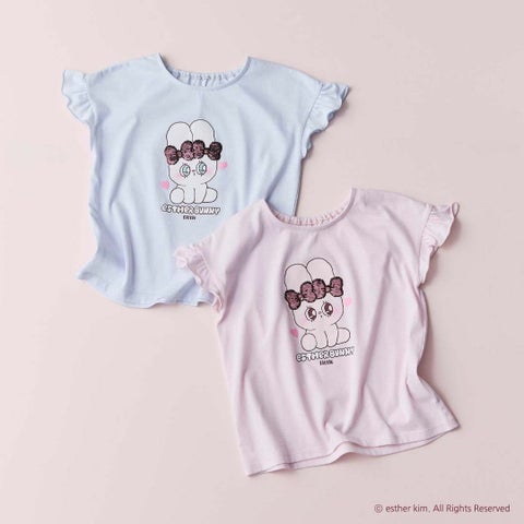 フロントに「エスターバニー リトル」のプリントと色の変わるスパンコール刺繍を施したTシャツです。袖はフリル袖でガーリーな印象を与え、肌あたりのよい天竺素材で夏まで着用できます。