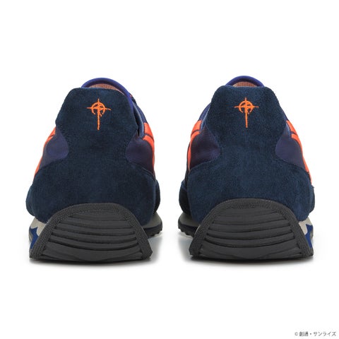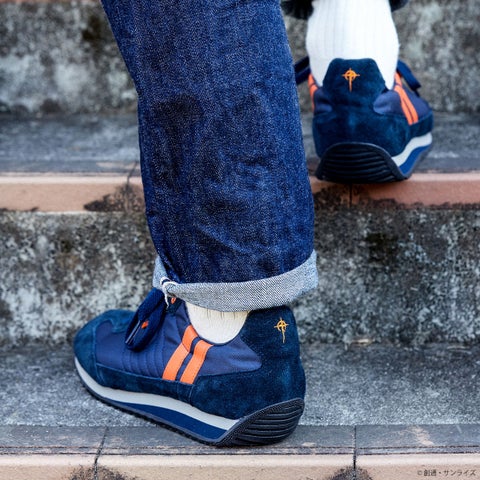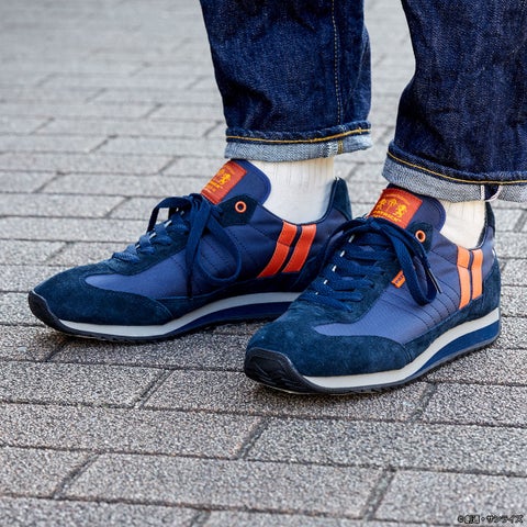 ネイビーを基調とした本体に、オレンジのラインを配したカラーリングが目を引きます。踵にはマフティーマークが刺繍され、シュータンにはオリジナルのネームが施されることで、限定感を高めるデザインに仕上がりました。スポーティでありながらも上品さを兼ね備え、Made in Japanの日本の職人技が光る高い品質の一足です。