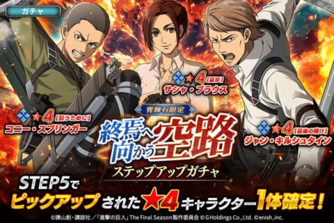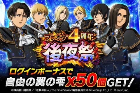 『進撃の巨人 Brave Order』にて新イベント「終焉へ向かう空路」を開催し、新登場の団員がピックアップされたガチャや4周年後夜祭、各種コンテンツへの高難易度追加を発表しました。
