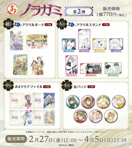 期間限定の『ノラガミ』第2弾まるくじで、ここでしか手に入らないオリジナルグッズを手に入れましょう。詳細は下記の販売ページよりご確認ください。